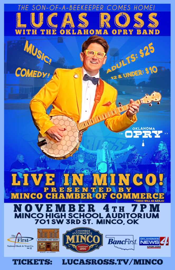 Over the past few years I have performed often with the Oklahoma Opry on their stage and on the road. We even did a live album, THERE WILL BE BANJO! Now, I’m getting to bring my songs and a very talented group of musicians, back to where it all began: Minco!